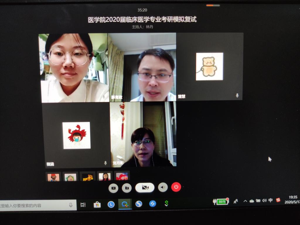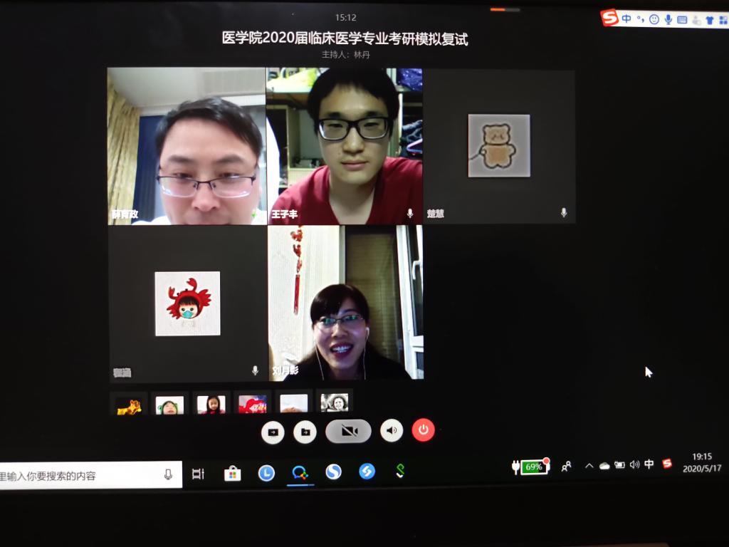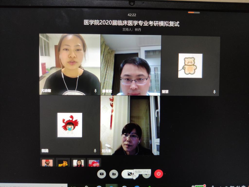 由于疫情原因,2020年度的硕士研究生复试相关工作受到了较大影响。为帮助毕业班学子顺利应对即将到来的考研复试,星空(中国)院于5月17日晚7时通过企业微信网络视频的方式,开展了考研线上模拟复试。附属医院儿科主任医师、副教授、质量管理处副处长刘月影,消化内科主任、主任医师薛育政以及学院临床1501班主任周跃涛三位老师应邀担任面试评审,星空(中国)院分团委书记、毕业班辅导员林丹老师主持会议。