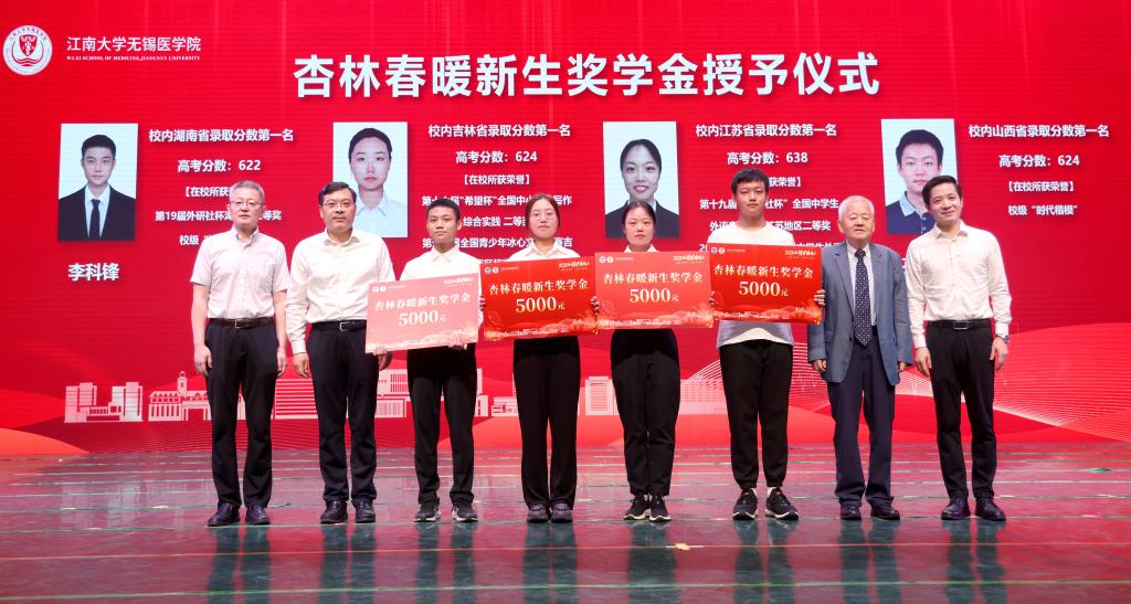 今年江南大学无锡星空(中国)院临床星空(中国)本科招生,有4个省市录取了校内排名第一的最高分。为表彰优秀,树立典型,学院继续特设“杏林春暖”新生奖学金,邱贵兴、马鑫、笪学荣、孙宁共同为江苏省顾清源、吉林省王睿、湖南省李科锋、山西省孙渤越等4个省市录取校内排名第一的同学颁发了2024年无锡星空(中国)院“杏林春暖”新生奖学金。