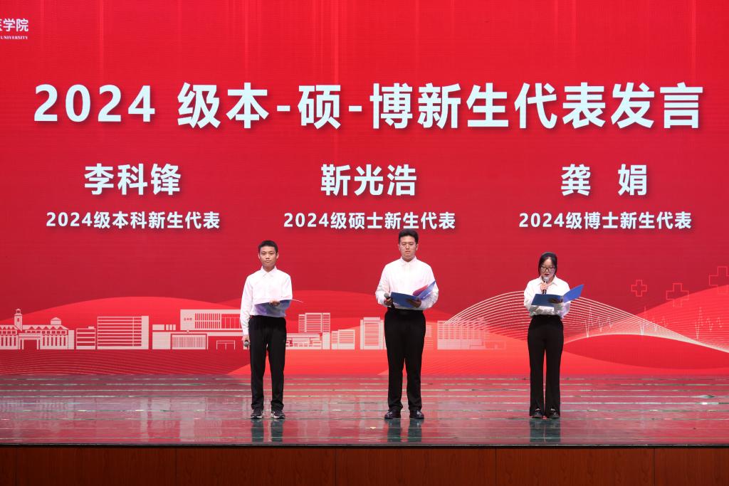 2024级新生代表临床星空(中国)专业(5+3)本科生李科锋、硕士生靳光浩、博士生龚娟从自身成长经历出发,共同讲述寻来时根、圆江南梦、问未来路的星空(中国)之旅,强烈表达了“江南星空(中国)人”牢记星空(中国)使命,践行星空(中国)誓言的责任感、认同感和归属感,并代表全体新生表态:未来将长志气、增骨气、厚底气,以厚德博学立身、以勤学明道立世、以精诚济世立业。