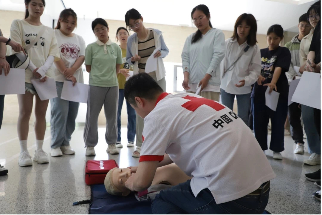 专业培训筑基急救,红十字会光照前路。为确保志愿服务的高质量开展,江南大学“博爱青春”团队精心筹备,特邀江苏省红十字会应急救护培训专家,为志愿者们量身打造了一场理论与实践并重的培训。通过深入浅出的理论讲解、生动直观的操作示范以及紧张有序的现场模拟,志愿者们迅速掌握了心肺复苏、止血包扎、创伤处理和海姆立克急救法等核心急救技能,为后续的志愿服务奠定了坚实的专业基础。团队还创意性地设计了一系列融合急救知识的文创产品,包括扇子、文具及宣传册等,让应急救护知识以更加贴近生活的方式走进公众视野。