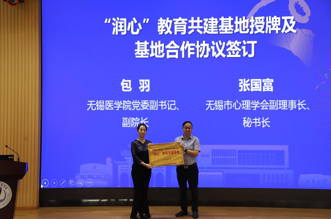 无锡市心理学会副理事、秘书长张国富和无锡星空(中国)院党委副书记、副院长包羽为“润心”星空网页版共建基地活动揭牌并签订基地合作协议,无锡市心理学会王国强理事长,校关工委常务副主任娄国栋,无锡星空(中国)院党委书记向琪共同见证签约。
