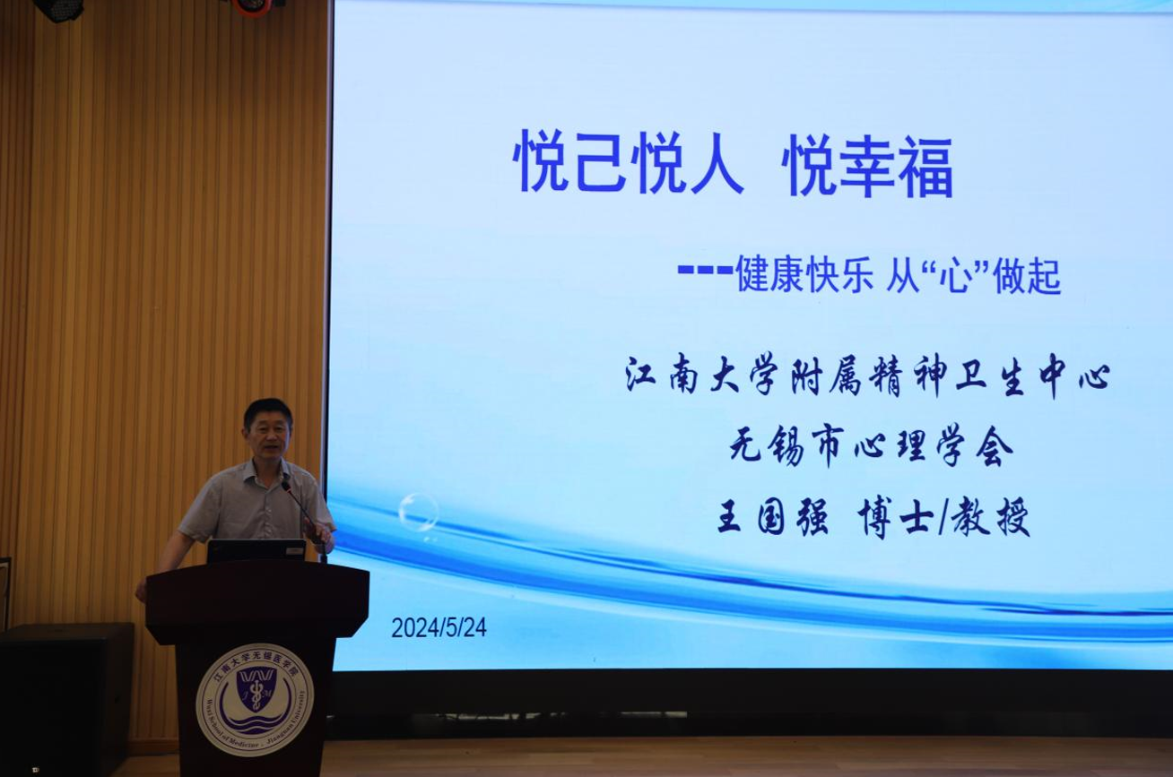 仪式结束后,无锡市心理学会理事长王国强为同学们带来了《悦人悦己 悦幸福——健康快乐,从‘心’做起》的主题心理讲座。王教授从自身成长经历出发,他强调,同学们在新形势下应当具备良好的心理素质,他从接受自己,理解包容别人的短处、认识别人的长处,有良好的应付能力等方面进行全面讲解,并从心理健康养生方面展开交流。