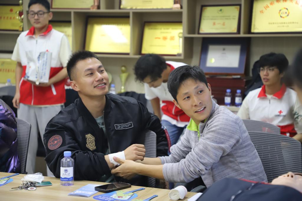 紧接着,志愿者结合校园中常见的急救场景,向教师们传授了各类伤口的包扎固定方法,并分发纱布等急救用具进行实操训练。同时,针对即将到来的炎热天气,团队成员还就中暑的现场判断与应急救护进行了深入科普,进一步增强了参训教师的防范意识和应急处理能力。