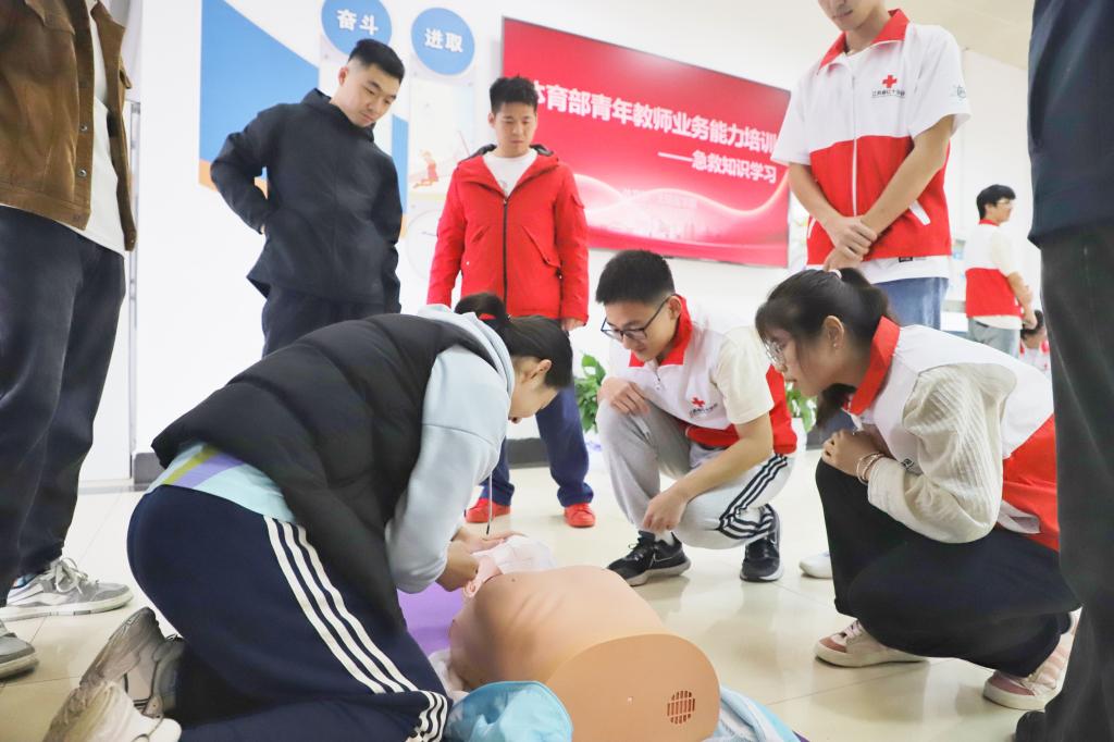 团队还重点介绍了心源性猝死的应急救护措施——心肺复苏术。他们详细讲解了如何通过“听、看、感觉”判断患者情况,并快速运用胸外按压、人工呼吸以及AED进行急救。在理论讲解的基础上,全体青年教师在志愿者的协助下进行了心肺复苏操作练习,确保了急救操作的规范性和有效性。