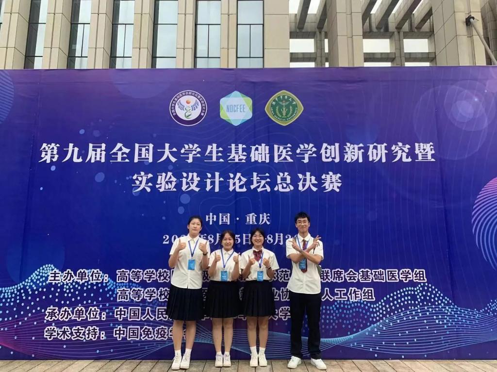 银奖由王雪、黄朝晖老师指导的史关祺、祝佳怡、杨欣玥、王炳基、余齐波学生团队获得,他们的参赛作品是“环状 RNA-CircPDHX抑制结直肠癌增殖及其机制研究”。由乔晨萌、申延琴老师指导的常磊、王锦、陈馨悦、申晓彤、许佳锋学生团队的参赛作品“Akk菌通过下调JAK2/STAT3通路缓解PD模型小鼠的神经炎症”和由葛雨秋、韩佩宇老师指导的陈鹤天、贺驿婷、盛吉祥、周奕学生团队参赛作品“衰老相关DNA甲基化:前列腺癌新生物标志物的发现及机制研究”获得全国铜奖。