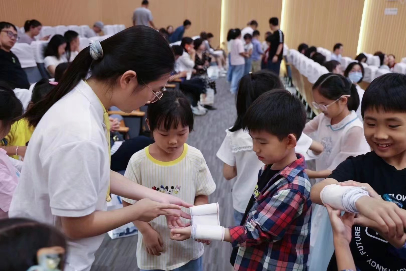 团队成员为青少年演示急救技能操作