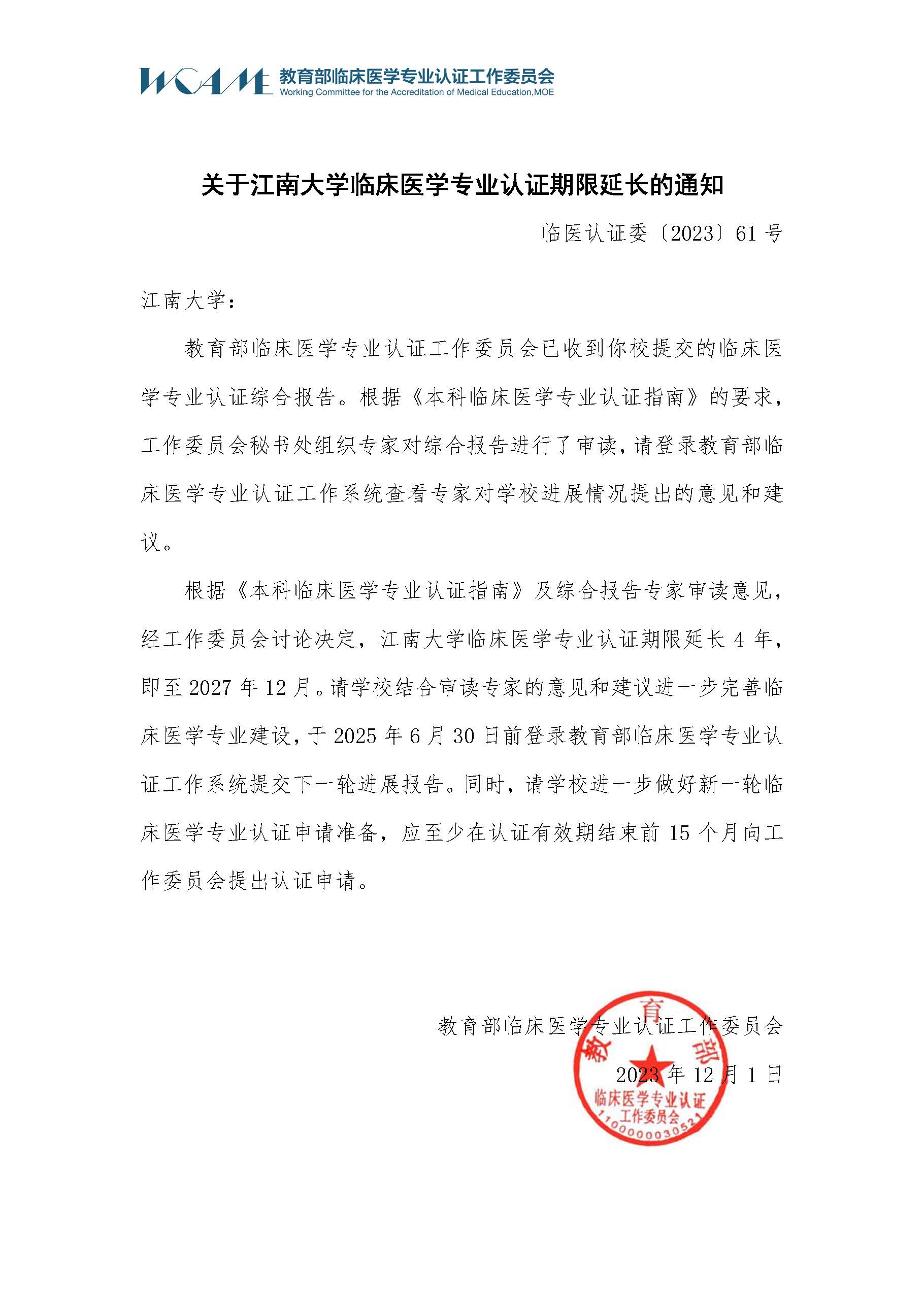 关于江南大学临床星空(中国)专业认证期限延长的通知