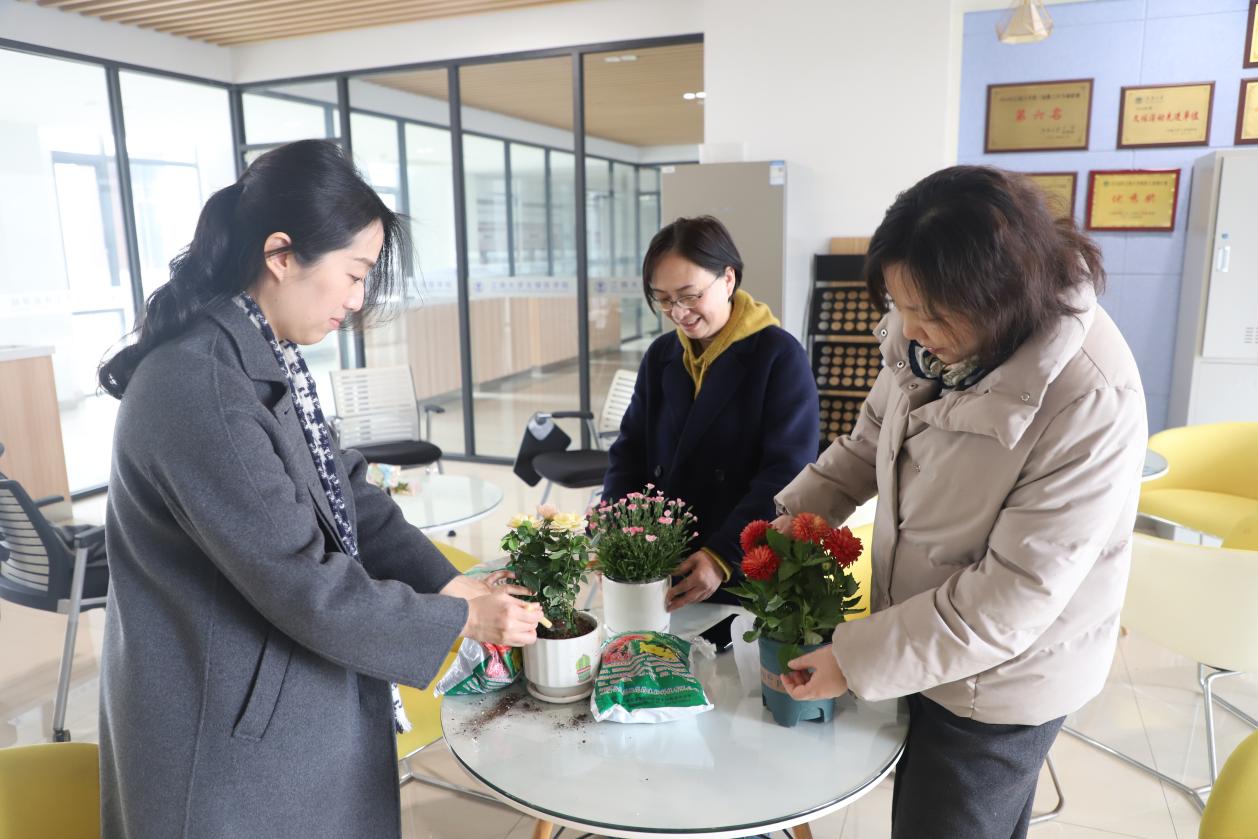 活动首站设于教师发展中心,女教职工们在专业花匠指导下亲手栽种绿植。大家精心挑选多肉、绿萝等盆栽,培土、修枝、装饰,看着亲手种植的一盆盆生机盎然的绿植点缀于办公环境中,大家感受到了盎然绿意和快乐心情!