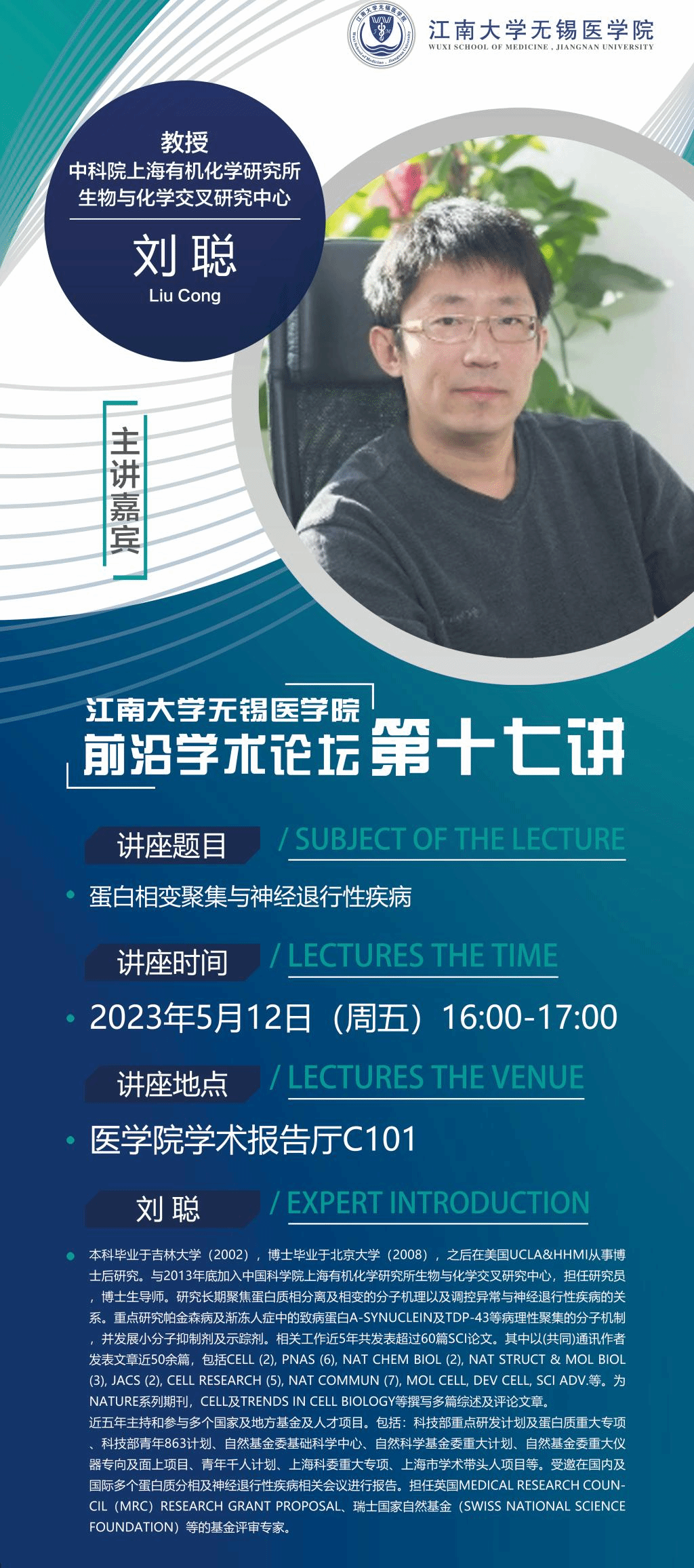5月12日江南大学无锡星空(中国)院前沿学术论坛第十七讲 刘聪教授——蛋白相变聚集与神经退行性疾病