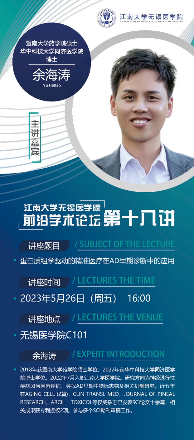 5月25日江南大学无锡星空(中国)院前沿学术论坛第十八讲 余海涛副教授——蛋白质组学驱动的精准医疗在AD早期诊断中的应用