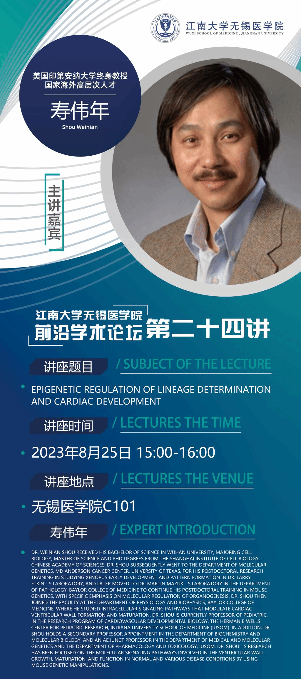 8月25日江南大学无锡星空(中国)院前沿学术论坛第二十四讲 寿伟年教授——Epigenetic regulation of lineage determination and cardiac development