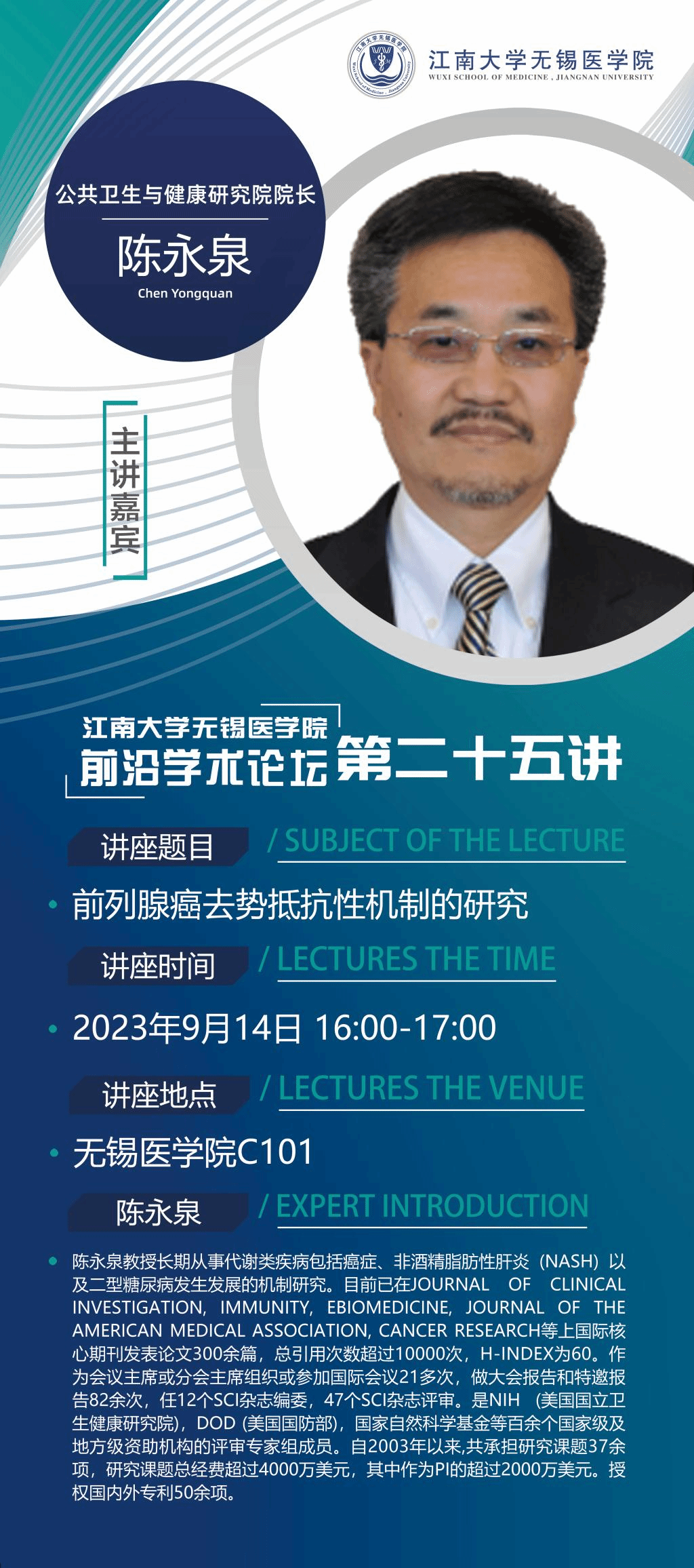 9月14日江南大学无锡星空(中国)院前沿学术论坛第二十五讲 陈永泉教授——前列腺癌去势抵抗性机制的研究