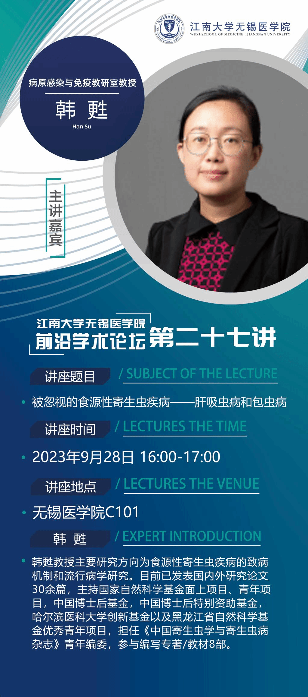 9月28日江南大学无锡星空(中国)院前沿学术论坛第二十七讲 韩甦教授——被忽视的食源性寄生虫疾病--肝吸虫病和包虫病