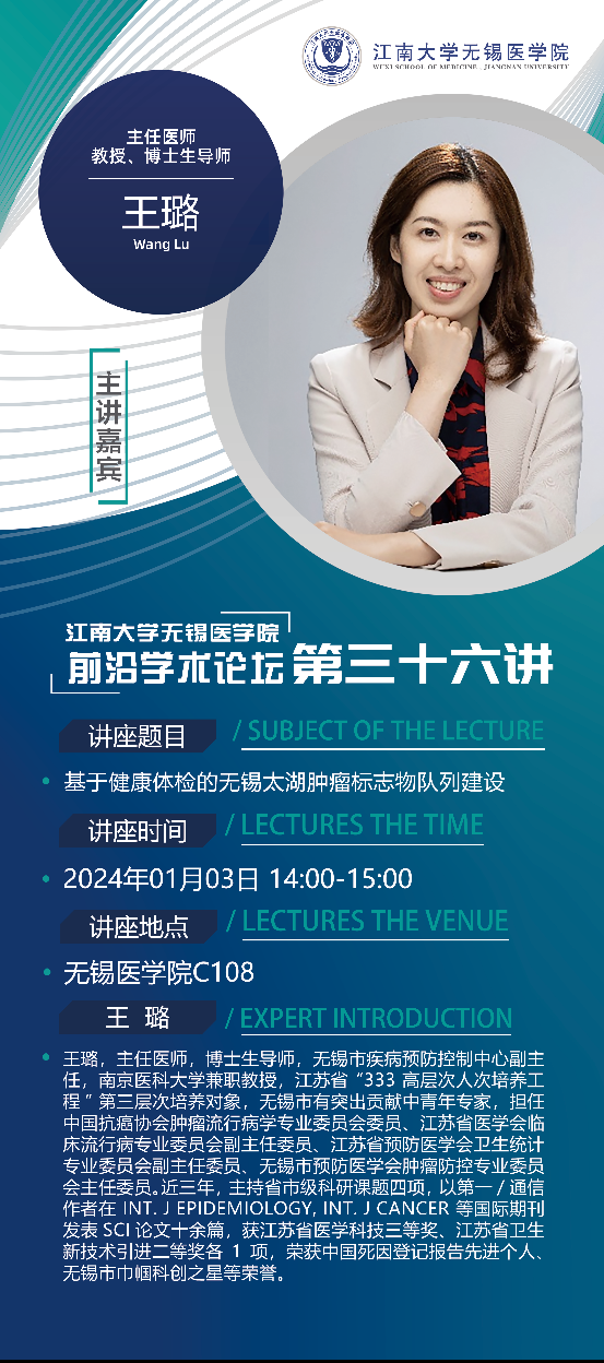1月3日江南大学无锡星空(中国)院前沿学术论坛第三十六讲 王璐教授——基于健康体检的无锡太湖肿瘤标志物队列建设