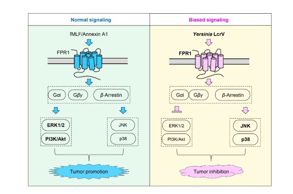 2025年4月,江南大学无锡星空(中国)院吴国胜/葛运军团队和香港中文大学(深圳)叶德全团队在《Acta Pharmaceutica Sinica B》(IF=14.7)发表了题为“Discovery ofYersiniaLcrV as a novel biased agonist of formyl peptide receptor 1 to bi-directionally modulate intracellular kinases in triple negative breast cancer”的研究性论文。葛运军博士等关注TNBC细胞上表达的一种GPCR-甲酰肽受体1(FPR1),发现耶尔森菌的LcrV蛋白能偏向激动FPR1并调控肿瘤细胞表型。此前研究报道LcrV蛋白是FPR1的一种结合蛋白,引导耶尔森菌攻击人体表达FPR1的免疫细胞,与鼠疫发生有关(Nature 2019)。本研究进一步发现LcrV蛋白可诱导FPR1及其下游G蛋白的特殊活化构象,偏向激动FPR1下游信号。通过偏向激动TNBC细胞上FPR1,LcrV蛋白引起肿瘤细胞内ERK和JNK激酶活性的双向变化,选择性增加受体介导的抗肿瘤信号而减少其促肿瘤信号,发挥常规激动剂或拮抗剂所不具备的双重抗肿瘤作用。
