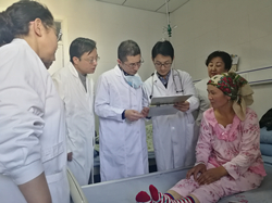 附院医生的到来就像一道喜讯,迅速传遍了这个边陲小城,连百公里外的边远牧区患者都纷纷慕名前来。第一台手术患者为阔韧带肌瘤,位置比较深,术中最主要是避免输尿管的损伤,由妇科许希中主任医师在腹腔镜下行子宫肌瘤剥除术。第二台手术患者子宫肌瘤十几年,现在如孕4月大小,身材肥胖,气管插管困难,麻醉科张邓新副主任医师手把手指导当地医生,在可视喉镜指引下顺利完成全麻。第三台手术患者意外跌伤,胸椎骨折,疼痛1天卧床不起,由骨科杨小奇副主任医师行经皮胸椎椎体成形术。据统计,短短2天时间,附院医疗队4名医生先后开展妇科手术8台、骨科手术1台,抢救病人1例,会诊40余人次,查房带教80余人次,举办学术讲座2场。其中,妇科许希中主任医师开展的腹腔镜下子宫肌瘤剥除术、麻醉科张邓新副主任医师开展的光棒可视下气管插管术和骨科杨小奇副主任医师开展的经皮胸椎椎体成形术均为阿合奇县人民医院首例。