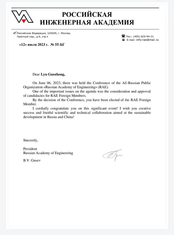 近日,俄罗斯工程院(Russian Academy of Engineering, RAE)院长古谢夫(B.V. Gusev)教授向中华星空(中国)会烧伤分会主任委员、国家应急星空(中国)研究中心主任、江南大学附属医院烧创伤诊疗中心主任吕国忠教授发来贺信,祝贺他当选为俄罗斯工程院外籍院士(FOREIGN FULL MEMBER, ACADEMICIAN)。