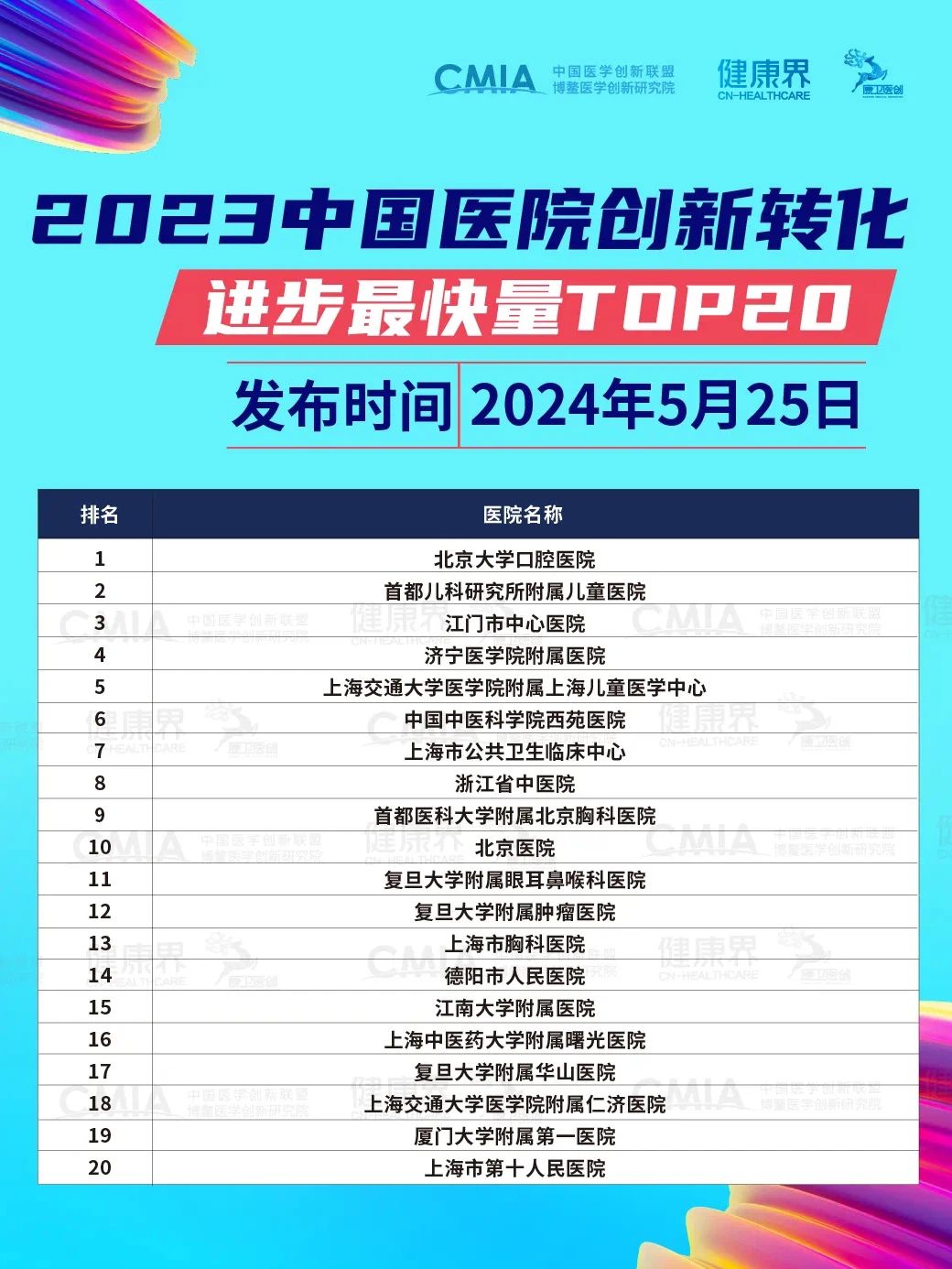 5月25日,在2024第六届CMIA星空(中国)创新大会主论坛上,备受关注的《2023中国医院创新转化100强》以及专利申请量、专利转化量等不同维度的9个评价名单正式发布。江南大学附属医院入选2023中国医院创新转化100强,同时入选“2023中国医院创新转化进步最快量TOP20”。