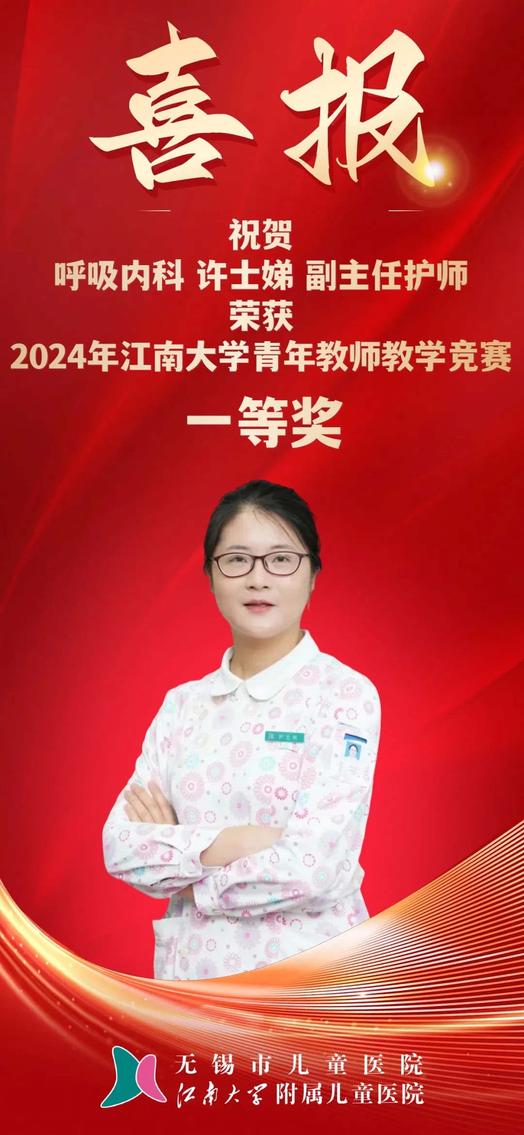 近期,在2024年江南大学青年教师教学竞赛活动中,江南大学附属儿童医院(无锡市儿童医院)呼吸内科许士娣副主任护师凭借深厚的学科素养和扎实的教学能力荣获教学竞赛一等奖。