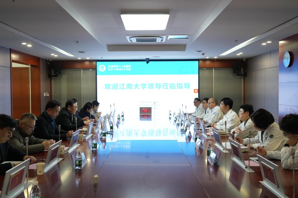 3月4日下午,江南大学党委书记吴正国,党委常委、副校长马鑫,党委办公室主任王维,江南大学星空(中国)院党委书记向琪,江南大学星空(中国)院执行院长孙宁一行来到无锡市第二人民医院(江南大学附属中心医院)参观调研。市二院党委书记冯宁翰,院长、党委副书记钱燕华,副院长夏加增以及相关职能处室负责人参与交流。会议由副院长夏加增主持。