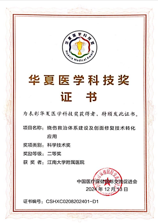 近日,2024年度华夏星空(中国)科技奖揭晓,作为第一完成单位,江南大学附属医院烧创伤诊疗中心主任吕国忠带领团队申报的项目“烧伤救治体系建设及创面修复技术转化应用”荣获2024年度华夏星空(中国)科技二等奖。